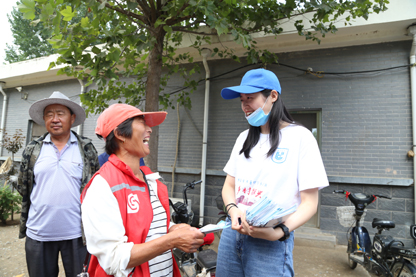 建行大学山东省分校泰安下乡实践队队员与环卫阿姨热情交流防诈骗知识。■ 赵艺伟/摄