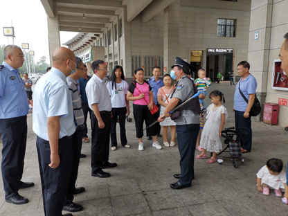 支行保安队员在支行大楼前向湄潭县委书记一行讲解制止和抓捕歹徒情况
