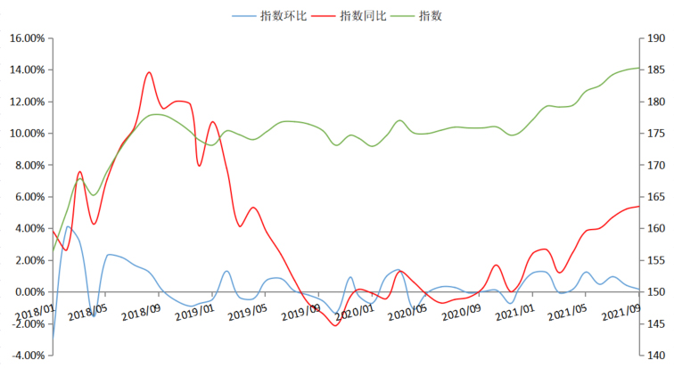 截至9月份,CPI中住房租赁指数连续十二个月下跌并于3月止跌回升,三季度反弹幅度扩大,建行住房租赁指数的指数同比趋势与CPI中住房租赁指数基本一致。近期,在促进共同富裕和发力内需的战略下,国家在住房政策上特别重视“降成本”,特别是降低新市民、年轻人的住房消费成本。为应对租金上涨,国家启动了新一轮市场秩序整顿,热点城市相继推出租金“参考价”。此外,“十四五”规划提出“低租金、小户型”的保障性租赁住房或将成为住房供应主体之一,热点城市均推出大规模的筹建计划,并在税收、金融、规划便利等方面提供支持,以降低租赁成本和租金价格,分流高度集中在商品房市场的租赁需求,国企积极参与和打造大型租赁平台,稳定租赁市场。未来,随着二手房越来越多投入租赁市场,保障性租赁住房成为供给侧改革的主角,多渠道租赁供给模式将形成,租赁供需结构将更加合理,租赁市场将更加平稳和健康。