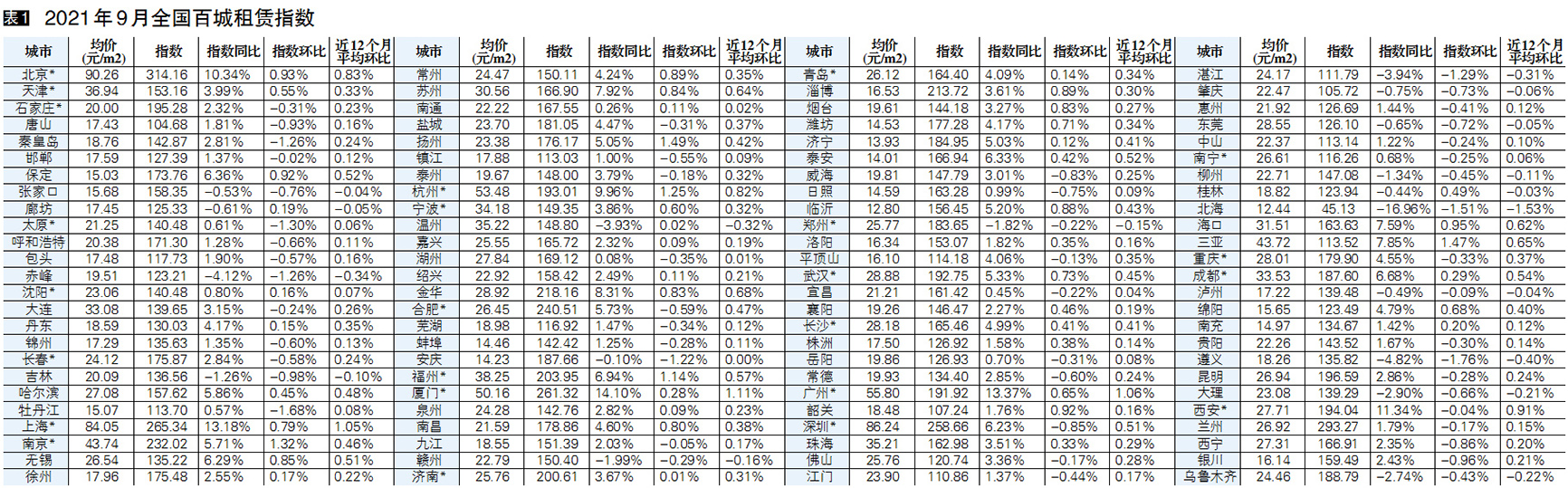 在国家持续调控房地产市场,重点城市房地产调控政策启动“地价-房价”联动、“新房-二手房”价格联动,热点城市启动二手房参考价,个人住房贷款紧缩,严厉整顿市场秩序等综合背景下,租赁指数上涨态势趋缓。与此同时,热点城市前期大规模自持或配建租赁地块逐步进入市场,保障性租赁住房筹建进入推进期,热点城市新增供地10%以上单列为租赁地块,实现供给端房源多样化,引导租赁需求分流,也有助于租赁指数保持相对稳定。预计今年四季度及明年,住房供给侧改革效果将开始显现,低成本租赁住房或将增加,目前处于高位的租赁指数和租金均价有望回落。综合来看,第四季度租赁指数或将呈高位触顶、季节性回落的态势。