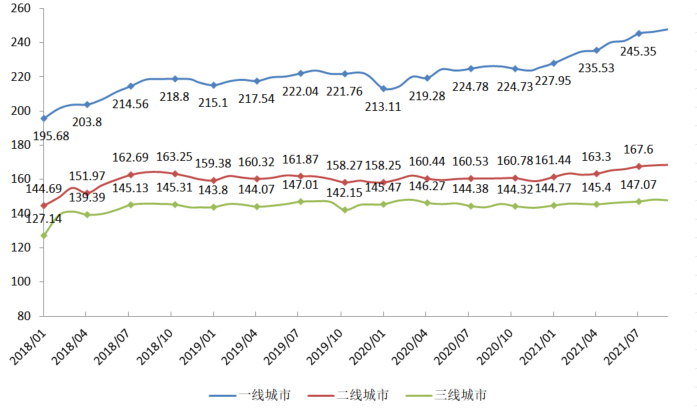 从租金均价上看,2021年三季度,一线城市租金均价为81.67元/平方米·月,略高于二季度水平,创有统计数据以来的新高(本统计口径自2009年1月开始);二线城市租金均价为31.37元/平方米·月,相较于二季度小幅上升;三线城市租金均价为18.73元/平方米·月,与二季度基本持平。