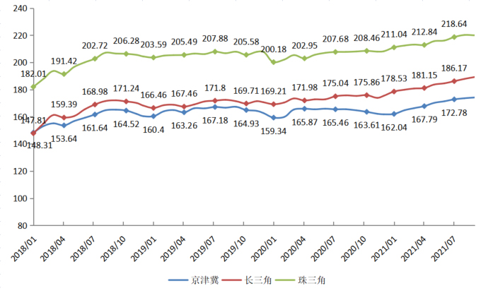 从租金均价上看,2021年三季度京津冀租金均价最高,为55.44元/平方米·月,同比涨幅高达7.80%,环比连续2个季度增长;长三角为48.31元/平方米·月,环比增长1.22%,同比增长7.74%,增幅较大;珠三角为52.41元/平方米·月,较二季度环比涨幅有所扩大,从1.86%升至3.15%,同比从二季度的6.86%骤升至12.83%。从总体来看,租金涨幅走势与指数类似,环比上升的动力不足。