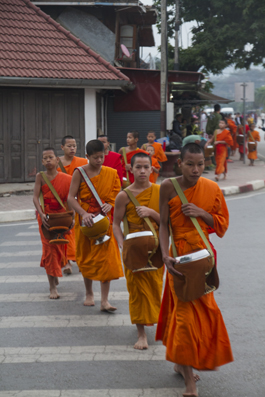 清晨,寺庙的僧侣光着脚,背着“锡铂”,沿途接受信徒或游客赠予的食物。这种“布施”风俗在老挝已经保持了千百年了