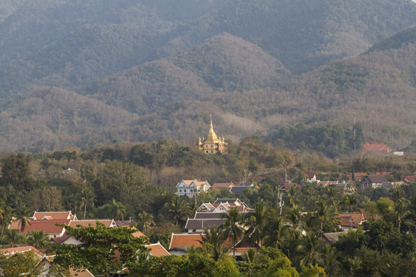 从浦西山鸟瞰琅勃拉邦古城。金色的寺庙历历在目
