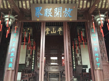 平山堂是个幽静所在,也是驰目骋怀的好地方。门外建了木棚,棚上爬满藤蔓,走进去一片荫凉。通堂式的敞厅之上,高悬“平山堂”三个大字的匾额,映入眼帘。