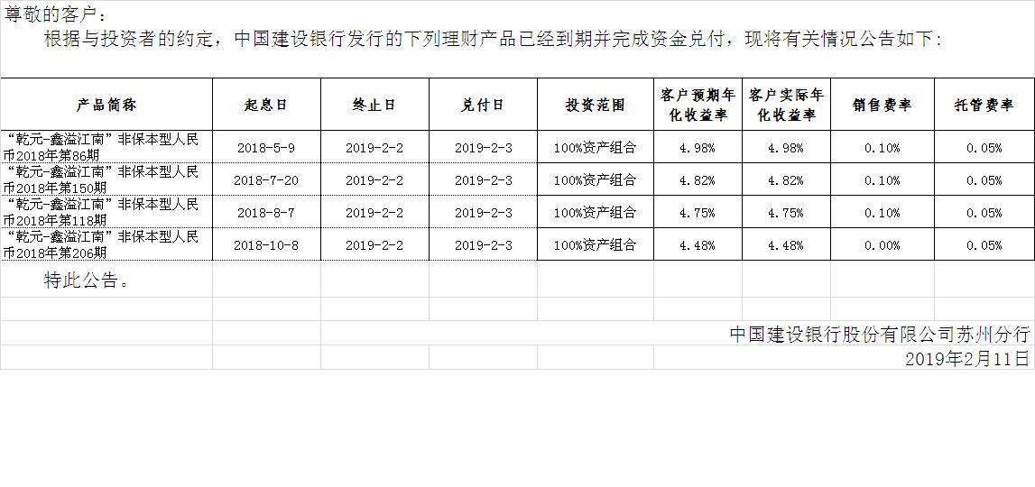 中国建设银行理财产品终止及清算公告
