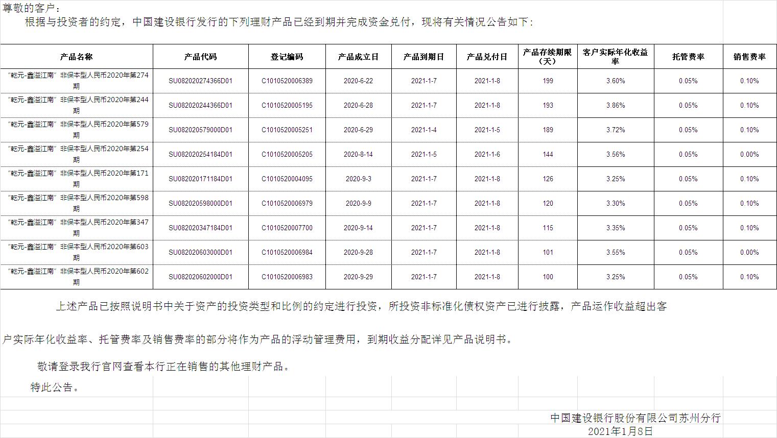 中国建设银行理财产品终止及清算公告