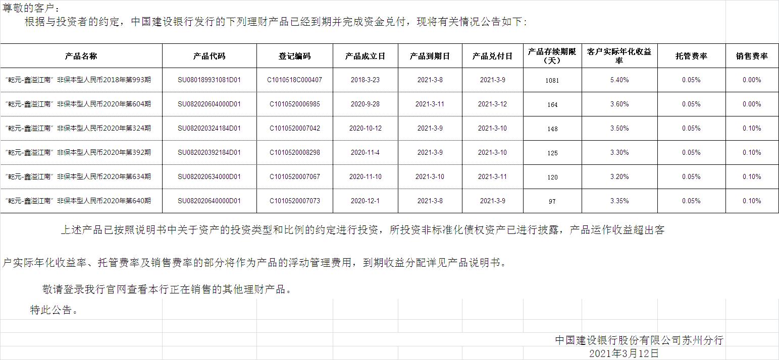 中国建设银行理财产品终止及清算公告
